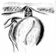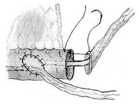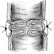 Для формирования клапана в проксимальном отрезке кишки накладывается 6 одиночных серозомышечных швов путем трех последовательных проколов стенки кишки с интервалом 1 см (см. рис. 6). После завязывания нитей образуется губовидный клапан (рис. 8). При достаточной длине проксимального участка кишки может быть сформировано последовательно два клапана с целью обеспечения большей надежности удерживающего механизма.