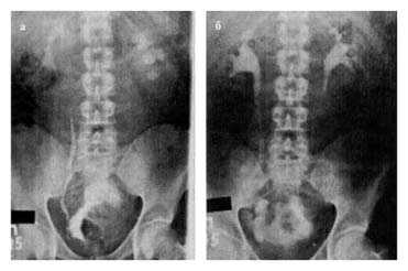 Рис.10. Экскреторная урограмма, выполненная у больного Д., 32 года, до (а) и через 3 недели после (б) операции
