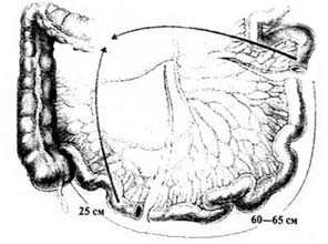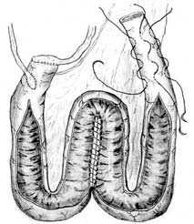 По линии разрезов брыжейки между мягкими кишечными жомами или с использованием сшивающих аппаратов рассекается тонкая кишка. Непрерывность кишечника восстанавливается наложением тонко-тонкокишечного анастомоза по типу "конец в конец", для чего используется одно- или двухрядный шов нитями Vicryl или Polysorb 3/0 или 4/0, может применяться также аппаратный шов. Отверстие в брыжейке ушивается с обеих сторон. Изолированный участок тонкой кишки отмывается от содержимого, после чего выполняется операция формирования резервуара.