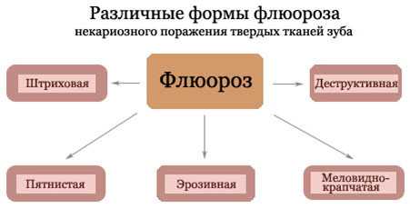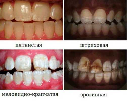 По причине возникновения стоматология выделяет эндемический и профессиональный флюороз. По клиническим проявлениям различают 5 форм заболевания: пятнистую и штриховую, меловидно-крапчатую, эрозивную и деструктивную. Первые две формы относят к флюорозу легкой степени. Меловидно-крапчатая форма считается флюорозом средней тяжести, а эрозивная и деструктивная формы — тяжелой степенью флюороза.