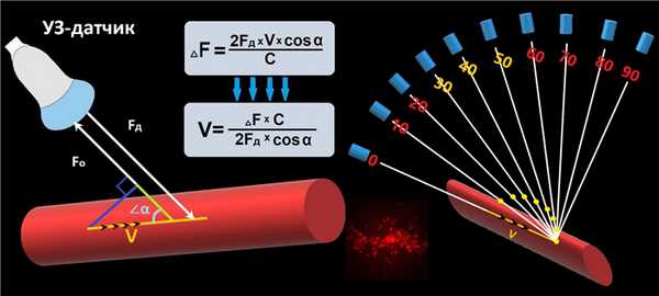 Когда ∠α ниже 25°, УЗ-луч почти полностью отражается от стенки сосуда. Чтобы определить скорость потока, направляете УЗ-луч под углом 25-60°.
