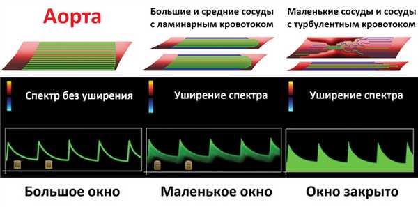 В аорте ворота пропускают равномерно движущуюся колонну из кровяных телец — спектр без уширения, большое спектральное окно.