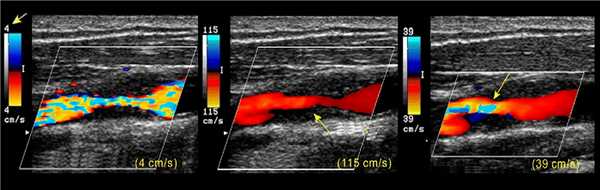 Радужные переливы (элайзинг) указывают высокоскоростной поток в месте стеноза. Настройте шкалу скорости: 4 см/с — низкая, 115 см/с — высокая, 39 см/с — правильная.