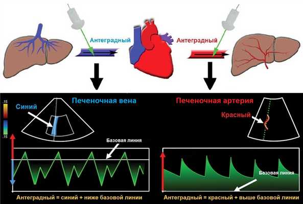 Антеградный поток печеночной вены К сердцу — сосуд синий, спектр ниже базовой линии; печеночной артерии ОТ сердца — сосуд красный, спектр выше базовой линии.
