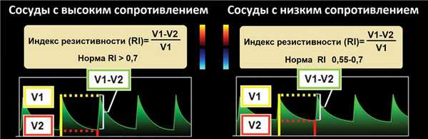 В сосудах с высоким сопротивлением в конце диастолы поток слабый, RI>0,7; в сосудах с низким сопротивлением в диастолу поток значимый, RI 0,55-0,7.