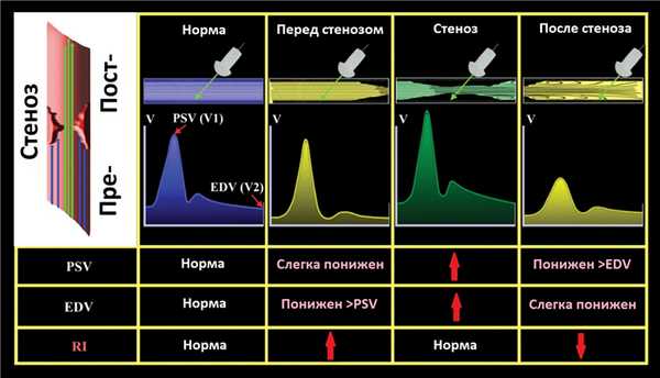 PSV и EDV высокие в месте стеноза; RI растет перед и падает после стеноза. После стеноза спектр имеет форму tardus-parvus: PSV поздняя — ТРТ>70 мс, PSV/TTP