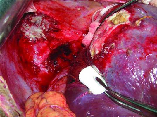 Произведены мобилизация правой доли печени и разделение сращений печени и диафрагмы тупым и острым путем. На этапе разделения сращений вскрыта гнойная полость между печенью и диафрагмой, эвакуировано около 50 мл сливкообразного гноя. После разделения сращений в VII-VIII сегментах печени определяется образование диаметром около 15 см, мягкой консистенции, состоящее из множества полостей (рис. 3). Рисунок 3. Интраоперационная картина абсцесса VII-VIII сегментов печени, поддиафрагмального пространства с прорывом в плевральную полость. Сделана биопсия, обнаружен некроз ткани. Правая печеночная вена и печеночно-двенадцатиперстная связка взяты на турникет.