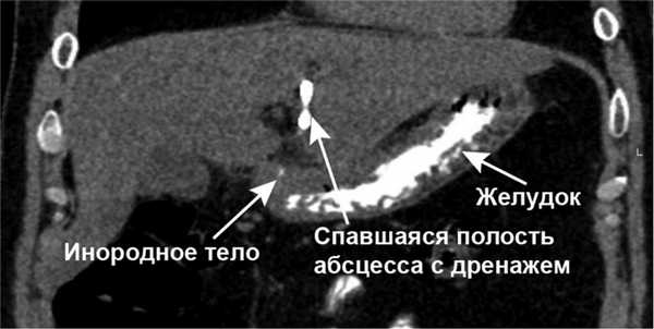 Разрешение этой ситуации возможно с применением пошагового, малоинвазивного подхода. Первый этап — перкутанное дренирование абсцесса печени под контролем УЗИ, второй — лапароскопическое удаление инородного тела из брюшной полости.