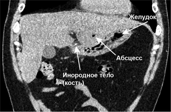 Инородное тело желудка (кость) может мигрировать в соседние органы, в данном случае — в печень, с образованием абсцесса, без развития клиники перфорации полого органа и перитонита.