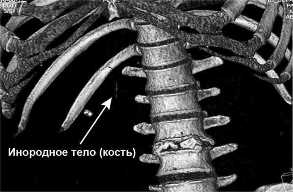 Наиболее часто проглатываются рыбные кости и кости иного происхождения. Однако рентгенограммы не всегда обнаруживают рентгенопозитивные инородные тела, особенно рыбные кости, так как большие массы мягких тканей и жидкость могут «застелить» содержание кальция в кости, в особенности у тучных пациентов [3]. Проспективное исследование, проведенное у 358 пациентов, проглотивших рыбные кости, показало, что рентгенположительный результат выявлен только у 32%. В этом случае компьютерная томография (КТ) с чувствительностью от 90 до 100% и специфичностью от 93,7 до 100% значительно превосходит рентгенографию. КТ показывает размеры, форму, локализацию, глубину застрявшего инородного тела, состояние окружающей ткани, что важно для назначения лечения и оценки рисков эндоскопического лечения. КТ не только предоставляет лучшую анатомическую информацию, но может обнаружить и такие осложнения, как формирование абсцесса, медиастинит или аорто-трахеальные свищи [6].