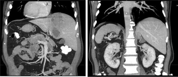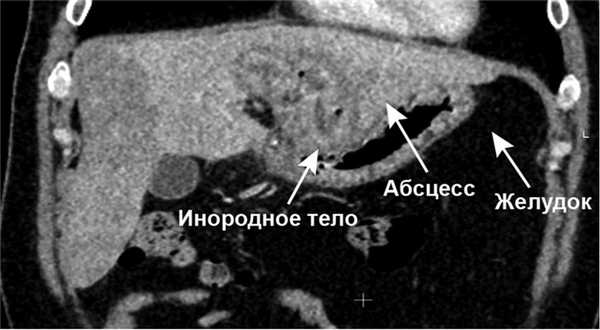Рис. 3. Пациент П. КТ органов брюшной полости в венозную фазу, фронтальный срез. Визуализируются инородное тело и абсцесс печени.