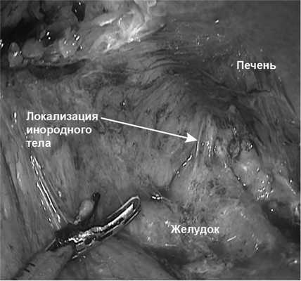 Через 14 дней выполнена операция: видеолапароскопия, адгезиолизис, удаление инородного тела из брюшной полости, ушивание стенки желудка. При этом в верхнем этаже брюшной полости отмечен выраженный спаечный процесс с формированием воспалительного инфильтрата, распространяющегося на желудок, левую долю печени и большой сальник (рис. 6).