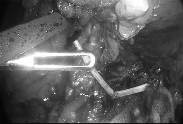 Рис. 7. Пациент П. Видеолапароскопия. Инородное тело желудка (кость) .