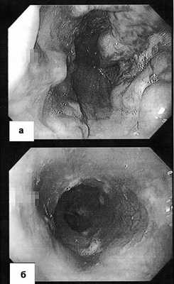 Из-за отсутствия признаков печеночной недостаточности при клиническом и лабораторном обследовании уже при поступлении наличие цирроза печени вызывало сомнения, было высказано предположение о внепеченочной портальной гипертензии, причиной которой явился тромбоз воротной вены вследствие заболевания крови. Мы выполнили эзофагогастродуоденоскопию, при которой в средней и нижней третях пищевода выявлены бугристые и извитые вены (варикозное расширение IV степени по классификации К. Paquet [2]), выступающие в просвет на 7-9 мм, с множественными эрозиями и «красными пятнами» - маркерами высокого риска кровотечения (рис. 2, а). Рисунок 2. Эзофагоскопия до (а) и после (б) мезентерикокавального шунтирования. Объяснения в тексте. Поэтому первым этапом мы выполнили эндоскопическое лигирование вен пищевода.