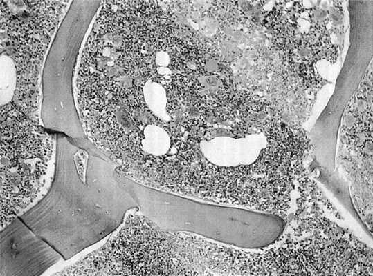 Для верификации диагноза с учетом выявленных гематологических изменений была выполнена трепанобиопсия из гребня подвздошной кости. При гистологическом исследовании обнаружены выраженная трехростковая пролиферация кроветворения с омоложением и дисплазией клеточных форм, скопления мегакариоцитов, незначительный очаговый перитрабекулярный, периваскулярный фиброз в строме (рис. 4). Рисунок 4. Микрофотография. Ув. 100. Трепанобиоптат: трехростковая пролиферация кроветворения. Окраска гематоксилином и эозином. Данная морфологическая картина соответствует эритремии (истинной полицитемии).