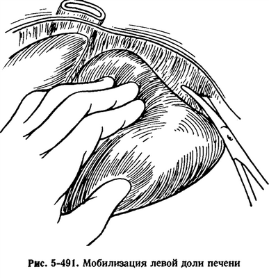 После ориентации в брюшной полостимобилизуют подлежащую резекции долю,отсекая фиксирующие ее связки. Для освобождения левой доли(рис. 5-491)следует перерезать круглую, серповидную, треугольную левую венечную связки печени до нижней полой вены, а также пече-