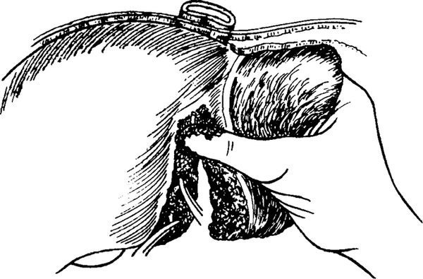 ночно-желудочную связку. Захватывая за отсеченную круглую связку, левую долю можно хорошо поднять из глубины брюшной полости.