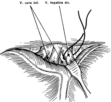 Глиссонова капсула отсекается скальпелем, а печеночная паренхима отделяется ручкой скальпеля или пальцем хирурга. За огромной правой долей препаровка правой печеночной вены еще более затруднена, как и ее перевязка и перерезка. Все это можно выполнить двумя путями. После обработки образований ворот печени и отделения выпуклой поверхности печени от диафрагмы вся печень переводится влево и к средине, при этом стремятся получить доступ к правой печеночной венесправа-снаружи.Правая печеночная вена открывается в нижнюю полую вену наиболее высоко из всех трех печеночных вен: непосредственно под верхним краем печени. Это и самая толстая из трех печеночных вен.