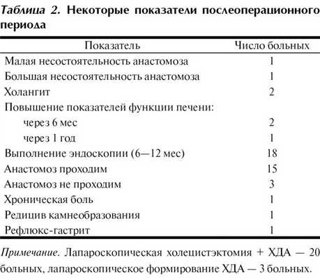 Несмотря на то что ХДА считается технически простой операцией, дающей хорошие ранние результаты, существует обеспокоенность такими осложнениям, как рефлюкс-холангит, рефлюкс-гастрит, проблема дистальной культи. Однако в нерандомизированном исследовании [5] была показана необоснованность этой обеспокоенности. Поскольку большой опыт лапароскопического формирования ХДА отсутствует, нет возможности высказать новые идеи относительно ценности этого метода. Согласно нашим данным, отдаленные результаты лапароскопического наложения ХДА могут расцениваться как удовлетворительные, хотя сама операция не обходится без осложнений. В частности, выраженность холангита, рефлюкс-гастрита, холедохолитиаза не очень высока, и в 82,7% наблюдений удается получить отличные и хорошие результаты. Эти показатели близки к таковым при двухэтапном лечении. Коме того, возможность лапароскопического наложения ХДА, если нельзя выполнить ЭПСТ, доказывает право этого метода на существование.