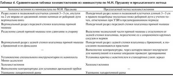 Для удобства понимания предложенной методики представлено сравнение ее с холецистэктомией из минидоступа по М.И. Прудкову (табл. 4).