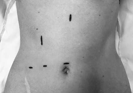 После ревизии второй 10-миллиметровый троакар установлен под мечевидным отростком. Третий и четвертый 5-миллиметровые троакары расположены в правом подреберье на уровне пупка.