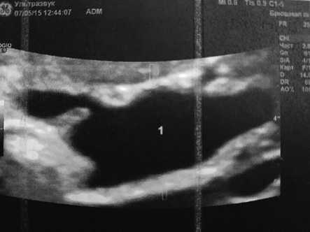Желчный пузырь: расположение обычное (подпеченочное), форма деформирована несколькими перегибами; размеры натощак 84—16 мм; стенки несколько утолщены до 3—3,5 мм, содержимое — однородная желчь; по внутреннему контуру стенок на всем протяжении определяется множество эхопозитивных образований повышенной эхогенности диаметром 1,5—2,5 мм — полипы.