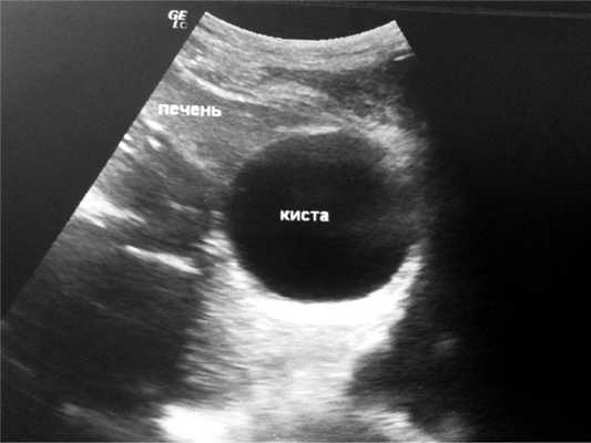 Рис. 1. Больной П., 39 лет. Эхинококковая киста в проекции 5—7-го сегментов печени до прорыва.