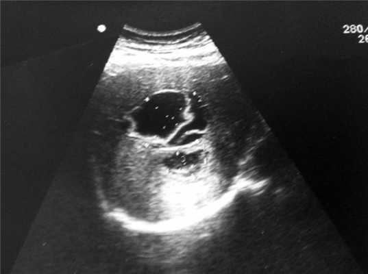 Верификация прорыва кисты в брюшную полость основана на данных УЗИ, КТ или МРТ. Критериями прорыва при эхинококкозе печени являются наличие свободной жидкости и эхинококковых кист в брюшной полости, наличие отслоившейся оболочки в полости кисты, изменение формы кисты с наличием внекистозной жидкости [5].