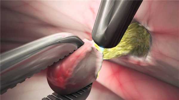 Рис. 3. Удаление хитиновой оболочки эхинококковой кисты в эндоконтейнер (эндофото собств. наблюдения).