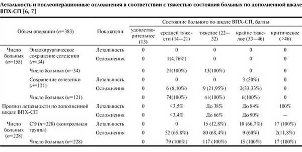 Число летальных исходов и послеоперационных гнойно-септических осложнений было прямо пропорционально исходной степени тяжести травмы и тяжести состояния пострадавших и статистически достоверно снижалось при сохранении травмированной селезенки более чем в 5 раз.