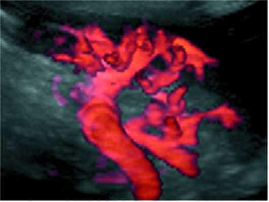 Трехмерная ультразвуковая реконструкция сосудов селезенки (рис. 4, а, б) Рисунок 4. Ультразвуковые ангиограммы. а - вид сосудов селезенки в режиме 3D-реконструкции после ОСО+ЛСА (06.09.02). Рисунок 4. Ультразвуковые ангиограммы. б - вид сосудов селезенки неоперированного добровольца, страдающего язвенной болезнью двенадцатиперстной кишки в режиме энергетической допплерографии (3D-режим). у больных после ОСО+ЛСА показала хорошо развитое магистральное артериальное дерево, отделение сегментарных сосудов от селезеночной артерии, их взаимоотношение между собой и деление на мелкие трабекулярные сосуды.