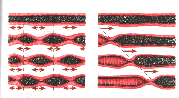 За счет двигательной активности наружных продольных и внутренних кольцевых мышц тонкой кишки происходит перемешивание химуса с соком поджелудочной железа и кишечным соком и продвижение химуса по тонкой кишке. В тонкой кишке различают несколько видов движений: ритмическая сегментация (рис.1), маятникообразные, перистальтические (рис.2), тонические сокращения.