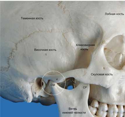 Рисунок 1 Височно-нижнечелюстной сустав в черепе (белый пунктирный круг), вид справа сбоку. СМ мыщелок нижней челюсти, СР венечный отросток. 1 Чешуйчатая часть височной кости 2 сосцевидный отросток височной кости 3 барабанная часть височной кости с наружным слуховым проходом 4 скуловой отросток височной кости
