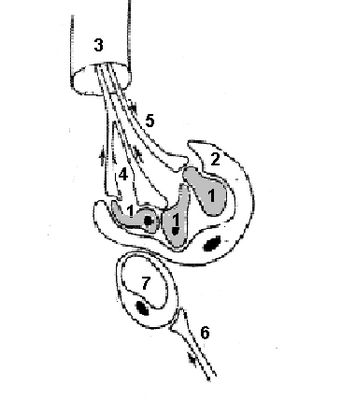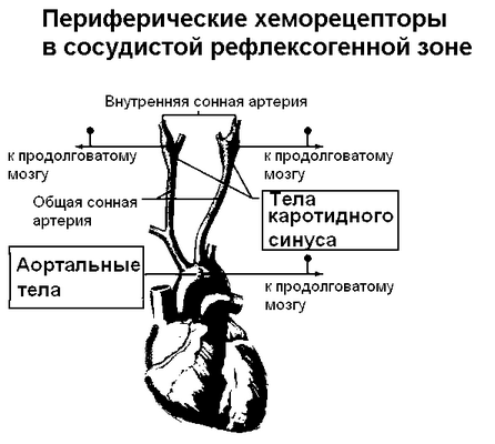 2) Место деления (бифуркация) общей сонной артерии (каротидный синус), т.е. в тех же зонах, что и барорецепторы, реагирующие на изменения кровяного давления. Однако, хеморецепторы представляют собой самостоятельные образования, заключенные в особых тельцах — клубочках или гломусах, которые находятся вне сосуда. Афферентные волокна от хеморецепторов идут: от дуги аорты — в составе аортальной ветви блуждающего нерва, а от синуса сонной артерии — в каротидной ветви языкоглоточного нерва, так называемом нерве Геринга. Первичные афференты синусного и аортального нерва проходят через ипсилатеральное ядро солитарного тракта. Отсюда хеморецептивные импульсы поступают к дорсальной группе дыхательных нейронов продолговатого мозга.