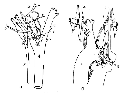 IX и X - языкоглоточный и блуждающий нервы, 1 - верхний шейный симпатический ганглий, 2 - синусный нерв, 3 - каротидное тело, 4 - общая сонная артерия, 5 - затылочная артерия, 6 - звездчатый ганглий, 7 - аортальный нерв, 8 - аортальные тела, 9 - дуга аорты
