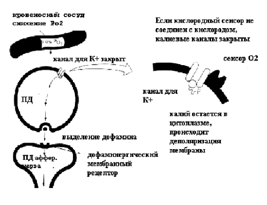Взаимодействие кислородного сенсора с кислородом приводит к активации калиевых каналов. В таком состоянии клетка находится практически постоянно, а ток калия из цитоплазмы поддерживает потенциал клетки на уровне мембранного потенциала покоя. Снижение напряжения кислорода в крови приводит к освобождению кислородного сенсора, калиевые каналы закрываются, мембранный потенциал уменьшается и достигает критического уровня деполяризации, в клетках I типа возникает потенциал действия. Возникновение ПД приводит к тому, что в клетках открываются кальциевые каналы и выделяется дофамин.