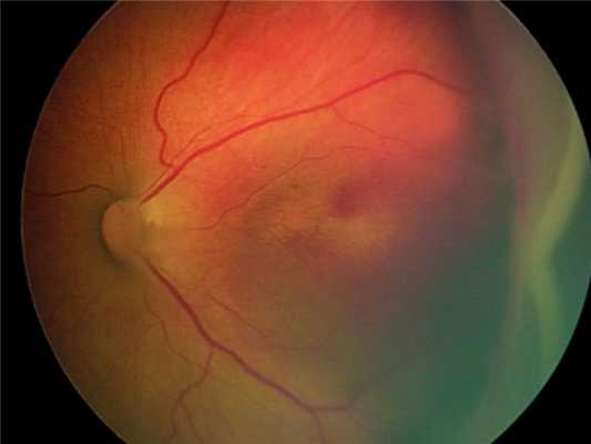 16 глаз мы отнесли к 1-му типу и назвали его «задняя РН первой зоны». Задняя РН первой зоны характеризовалась наличием ретинальных сосудов в круге с центром в центре диска зрительного нерва (ДЗН) и радиусом до центра макулы (рис. 1). Рисунок 1. Задняя РН первой зоны.