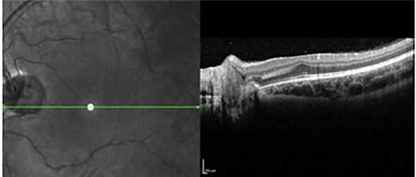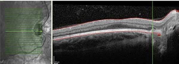 Рис. 2. Смещение ретинальных сосудов и эктопия макулы в носовую сторону (данные ОКТ).