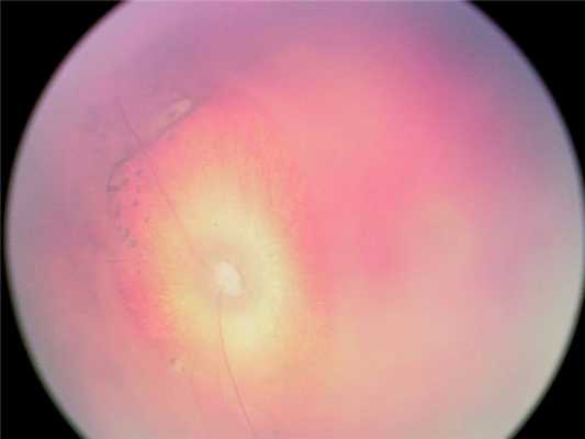 В результате хирургического лечения удовлетворительные анатомические результаты достигнуты на пяти глазах (на трех глазах с 4а стадией и на двух глазах с 4в стадией) (рис. 7). Рисунок 7. Прилегание сетчатки в центральной зоне после ленссберегающей витрэктомии. На двух глазах развилась воронкообразная отслойка сетчатки, что было обусловлено геморрагическими, экссудативными и репролиферативными осложнениями во время операции и в раннем послеоперационном периоде.