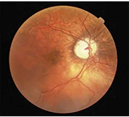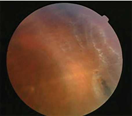 Рис. 5. Поздняя субтотальная отслойка сетчатки регматогенного характера на глазу с РН II степени и частичной атрофией зрительного нерва.