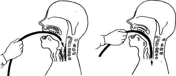 - Продвигать зонд по задней стенке глотки, предлагая пациенту производить глотательные движения.