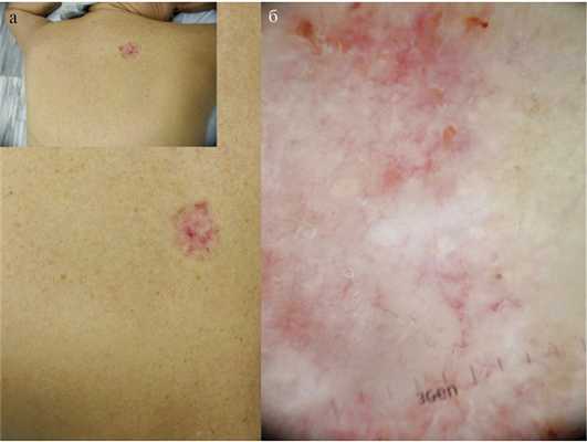 Патоморфологическое описание: асимметричная общая структура, атипичные меланоциты расположены в эпидермисе преимущественно в верхних отделах сосочкового слоя дермы с ядерным плеоморфизмом в одиночку и гнездами. Заключение: пигментная меланома, уровень инвазии по Кларку II, толщина менее 1 мм по Бреслоу, без изъязвления (рис. 1а, б).