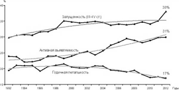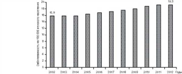 Не исключением является и наша страна, поскольку заболеваемость злокачественными опухолями шейки матки, к сожалению, не имеет тенденции к снижению. В течение последнего десятилетия отмечается постепенный рост заболеваемости РШМ: среднегодовой прирост составил 2,35%, общий - 26,94% (рис. 1). Рисунок 1. Динамика «грубых» показателей заболеваемости РШМ, 2002-2012 гг. Среди органов репродуктивной системы РШМ занимает третье место (14%) после РМЖ (54,5%) и эндометрия (19,3%). По-прежнему остаются высокий удельный вес запущенных стадий (38%) и первогодичная смертность (17,0%) [4]. Такой статистический показатель, как летальность больных в течение года с момента установления диагноза злокачественного новообразования, достоверно свидетельствует, в первую очередь, о фактической запущенности опухолевого процесса, а также качестве лечения.
