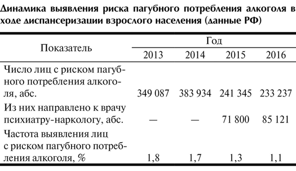 В 2016 г. в России по результатам диспансеризации из 22 млн человек были выявлены 233 237 лиц с риском пагубного потребления алкоголя. Как видно из данных, представленных в таблице, Динамика выявления риска пагубного потребления алкоголя в ходе диспансеризации взрослого населения (данные РФ) частота выявления лиц, имеющих риск пагубного потребления алкоголя, снизилась за период 2013—2016 гг. с 1,8 до 1,1%.