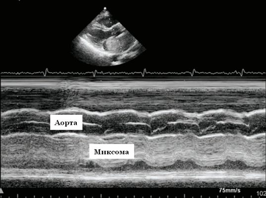 Миксомы могут быть легко обнаружены с помощью M-режима или 2-D эхокардиографии. Миксома может рассматриваться как образование в полости ЛП и может пролабировать через МК в полость ЛЖ во время диастолы, затрудняя кровоток. Она может быть настолько большой, что заполняет все предсердие. Допплер может показать гемодинамические эффекты данной опухоли.