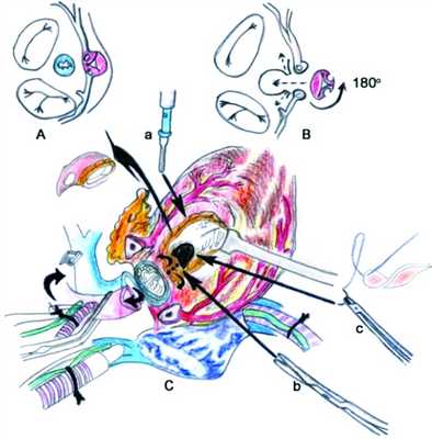 Операцию выполняли из срединного доступа в условиях искусственного кровообращения (ИК) и гипотермии (28 °C) с бикавальной канюляцией. После начала ИК системно-легочный анастомоз был клипирован и пересечен. Кардиоплегию выполняли антеградно в корень аорты раствором кустодиол. Левые отделы были дренированы через отверстие, созданное в межпредсердной перегородке. Аорта и легочная артерия пересечены над синусами. Клапан легочной артерии двухстворчатый, створки плотные, раскрытие недостаточное. В области ВОЛЖ отмечается стеноз за счет гипертрофированной конусной перегородки. Из аортальных синусов высечены на площадках правая и левая коронарные артерии. Аортальный клапан высечен отдельно единым блоком из миокарда ПЖ, створки клапана легочной артерии иссечены и полностью рассечена конусная перегородка. Дефект закрыт заплатой из ксеноперикарда. Затем аортальный аутографт ротирован вдоль продольной оси на 180° от своего изначального расположения и имплантирован в ВОЛЖ с фиксацией переднего края к ксеноперикардиальной заплате. В соответствующие отверстия в стенке аортального аутографта имплантированы левая, затем правая коронарные артерии. Выполнен прием Lecompte, после чего концы аорты анастомозированы между собой. В легочную позицию вшит легочный клапанный гомографт («свежеприготовленный») диаметром 25 мм. Выполнен дистальный анастомоз между гомографтом и бифуркацией легочной артерии (см. рис. 1 и далее на цв. вклейке). Рисунок 1. Схематическое изображение операции. A, B - иссечение корня аорты, его поворот на 180° с последующей реимплантацией коронарных артерий. Основные хирургические особенности (C): корень аорты выделяют из миокарда правого желудочка (а), рассекают суженное кольцо клапана легочной артерии и конусную перегородку (b), закрытие дефекта межжелудочковой перегородки при помощи ксеноперикардиальной заплаты (с).