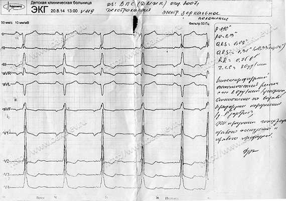 В лёгких ясный лёгочный звук. ЧД — 22 в мин. Дыхание везикулярное, проводится во все отделы, хрипов нет. Сердце расположено справа. ЧСС 94 уд/мин. Систолический шум над всей областью сердца, эпицентр вдоль правого края грудины. Частота пульса 94, удовлетворительного наполнения. Пульсация на верхних и нижних конечностях отчетлива, симметрична. Артериальное давление: на левой руке — 113/58 мм. рт. ст., на правой руке — 110/60 мм. рт. ст. Язык чистый, влажный. Печень расположена слева, не увеличена. Cелезёнка не пальпируется. Стул со слов папы б/о. Мочеполовая система сформирована по мужскому типу. Зрение б/о. Слух б/о. Нервная система без грубой очаговой патологии. Умственное развитие — в соответствии с возрастом.