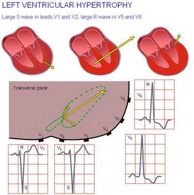 Для того, чтобы заподозрить гипертрофию левого желудочка, вполне достаточно выполнить стандартную электрокардиограмму. Основными критериями гипертрофии левого желудочка на ЭКГ являются нарушения процессов реполяризации (иногда вплоть до ишемии) по грудным отведениям косовосходящая или косонисходящая элевация сегмента ST в отведениях V5, V6, может быть депрессия сегмента ST в III и в aVF отведениях, а также отрицательный зубец Т). Кроме этого, на ЭКГ легко определяются вольтажные признаки - увеличение амплитуды зубца R в левых грудных отведениях - I, aVL, V5 и V6.