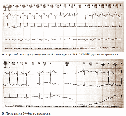 У 2-3 детей групп сравнения (2,6-2,3%) с тяжелой церебральной ишемией и внутрижелудочковыми кровоизлияниями, очевидно, вследствие глубокого гипоксического угнетения пейсмекерной активности клеток синусового узла и незрелости центральных механизмов регуляции сердечного ритма, выявлена синусовая брадикардия с ЧСС ниже 2 перцентиля (91 уд/мин для детей первой недели жизни) в среднем 87,3±3,96 уд/мин. Выявляемость наджелудочковой экстрасистолии у детей исследуемых групп составила 6-8%, в единичных случаях регистрировалась миграция водителя ритма. У одного ребенка группы сравнения в 1 день жизни выявлено трепетание предсердий (заподозренное внутриутробно и послужившее показанием для экстренного оперативного родоразрешения на сроке 36 недель) с ЧЖС около 300 уд/мин и проведением на желудочки 2:1. Ритм восстановлен электрической кардиоверсией [18].