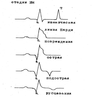 1. ишемия (несколько минут от момента окклюзии КА): вследствие дефицита кислорода происходит изменение реполяризации, что соответствует изменению на ЭКГ зубца Т; затем